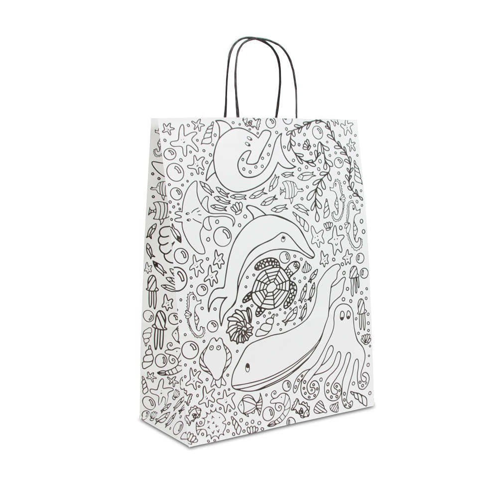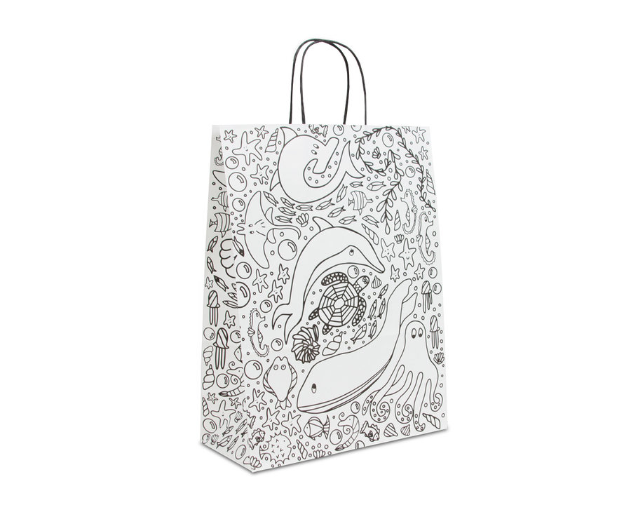 Wilt u basic papieren tassen bestellen waarop getekend kan worden? Kies dan voor twisted papieren tassen – Kleurplaat. Dit model is gemaakt van wit kraft papier en is voorzien van 2 zwarte papier gedraaide koorden.