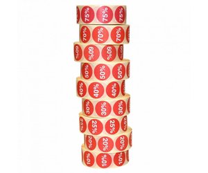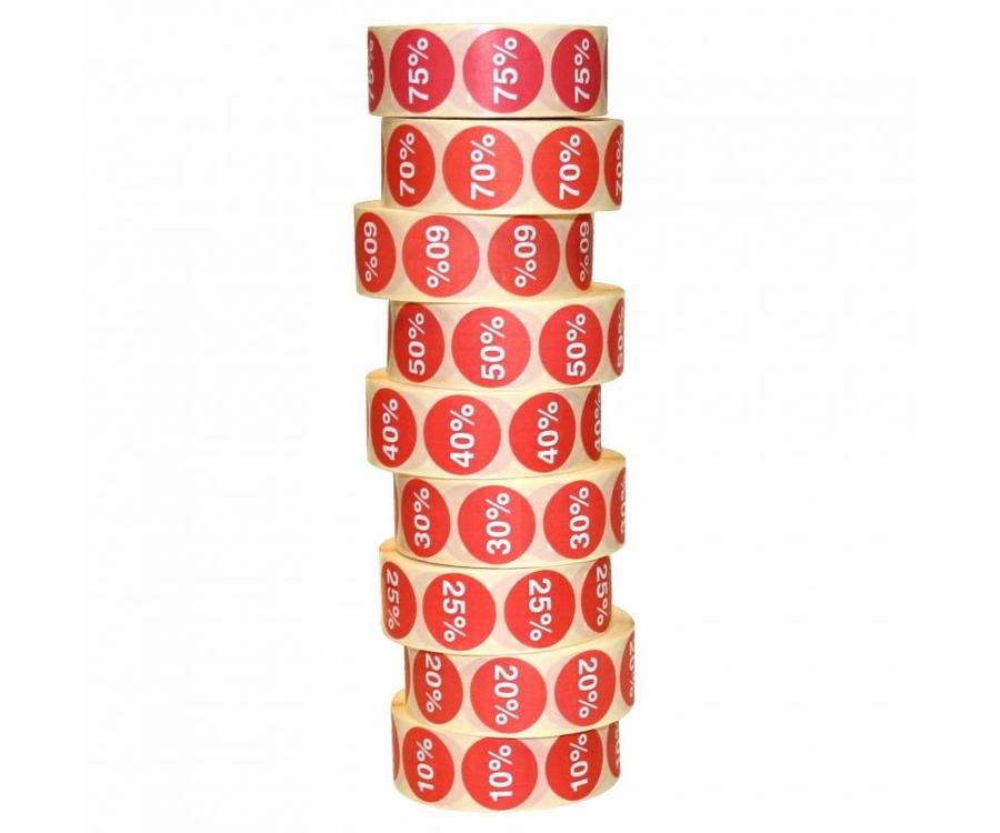 Deze etiketten zijn op rol leverbaar en beschikbaar in 7 verschillende kortingspercentages á 1.000 stuks per rol.