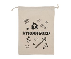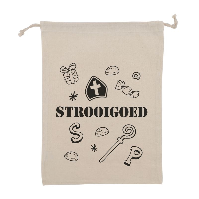 Piet! Piet! Met dit katoenen zakje sta je vooraan tijdens de intocht van Sinterklaas. Piet zal dit mooie zakje zeker niet overslaan om te vullen met heerlijk strooigoed. Het zakje is gemaakt van stevig katoen en voorzien van een vrolijke print aan 1 zijde die perfect past bij de feestelijke sfeer van Sinterklaas. Dankzij het handige katoenen trekkoordje is het zakje eenvoudig af te sluiten, zodat al dat lekkers veilig bewaard blijft.