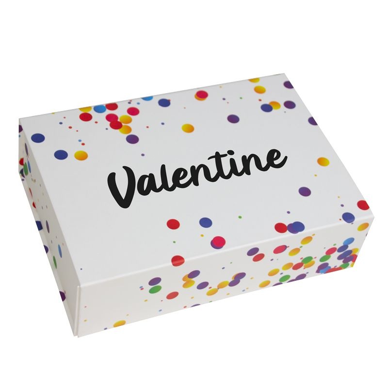 Bent u op zoek naar luxe geschenkdozen om uw producten mooi in te presenteren? Kies dan voor ecologische confetti magneetdozen - Valentijn. Confetti magneetdozen - Valentijn worden plat geleverd en zijn eenvoudig op te zetten. Deze magneetdozen zijn gemaakt van sterk gerecycled karton en omplakt met kraft papier. De klep is hersluitbaar door middel van magneetjes in de klep. Confetti magneetdozen - Valentijn zijn vanuit voorraad leverbaar en in verschillende standaardkleuren en formaten te bestellen. Confetti magneetdozen - Valentijn kunnen zowel met als zonder bedrukking snel geleverd worden.Bestel uw bedrukte of onbedrukte confetti magneetdozen - Valentijn