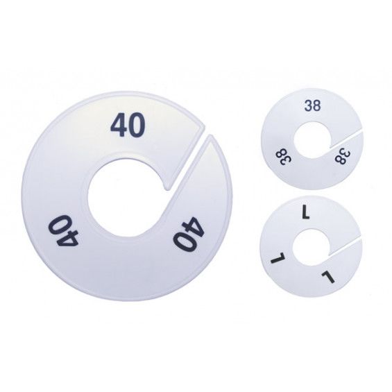 Deze wit kunststof maatringen met zwarte bedrukte zijn leverbaar met de letters en cijfer aanduiding XXS t/m 3XL De maatvoering van de ring is 11cm rond.