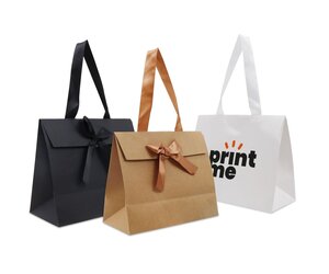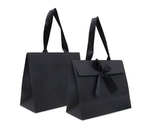 Deze draagtas is gemaakt van 190 grams zwart Kraft papier uitgevoerd met klep + strik in het zwart. Dit geeft het kado tasje een stevige en mooie luxe uitstraling.