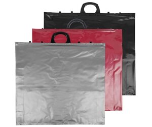Deze sterke draagtas is gemaakt van 150 micron LDPE plastic en heeft een brede sluiting met beugel handgreep. De tas wordt door het grote formaat vooral veel gebruikt in de kledingbranche.