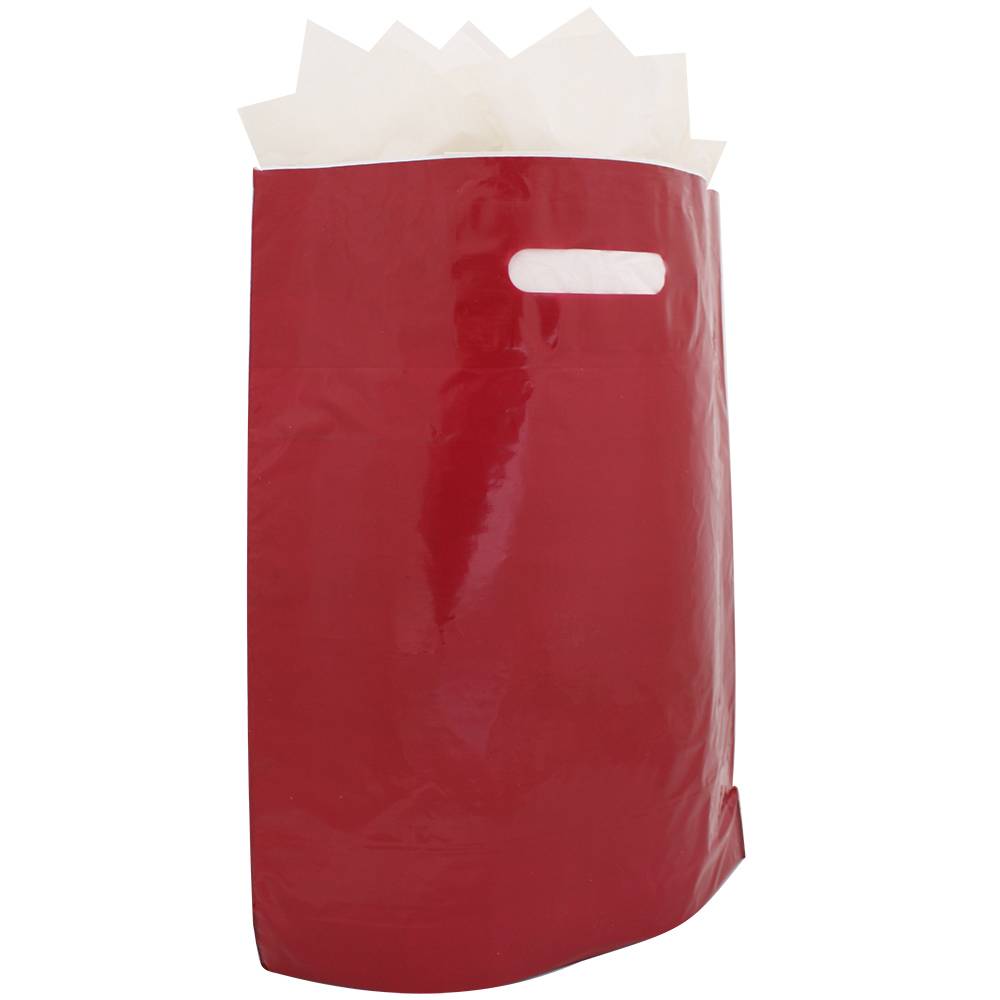 Deze sterke plastic draagtas is gemaakt van 40 of 50 micron LDPE (Lage Dichtheid Polyetheen). Hierdoor kan deze draagtas relatief veel gewicht dragen en vaker worden gebruikt. Deze multi-functionele draagtas heeft gestanste handgrepen die versterkt zijn met een extra laag plastic.