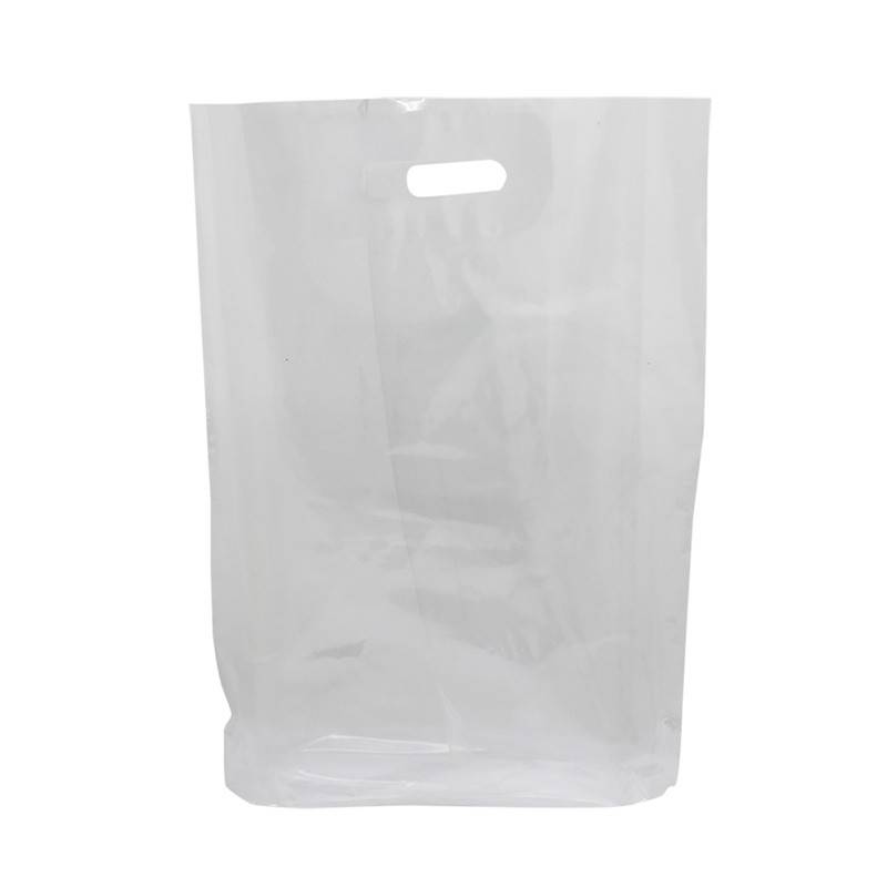Deze sterke plastic draagtas is gemaakt van 40 of 50 micron LDPE (Lage Dichtheid Polyetheen). Hierdoor kan deze draagtas relatief veel gewicht dragen en vaker worden gebruikt. Deze multi-functionele draagtas heeft gestanste handgrepen die versterkt zijn met een extra laag plastic.