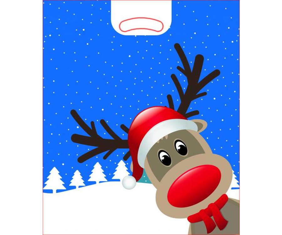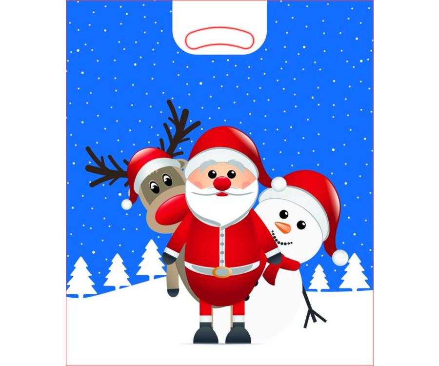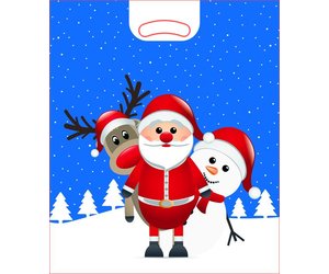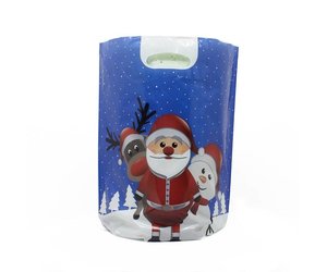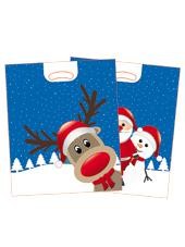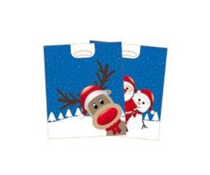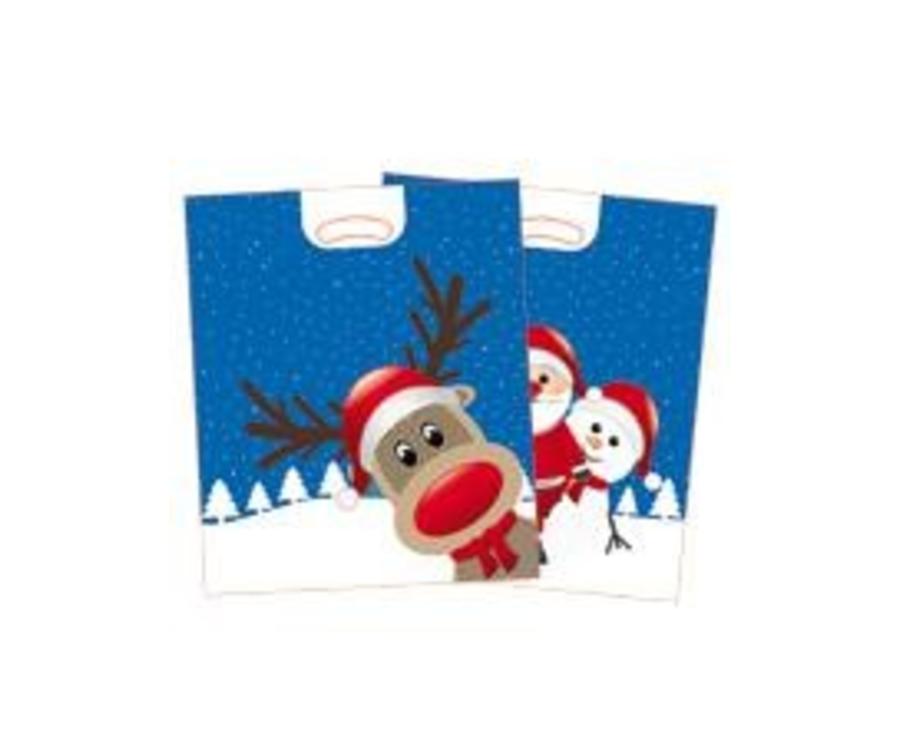 De voor en achterkant van deze stevige draagtas hebben verschillende afbeeldingen. Gemaakt van 45 micron LDPE. De gestanste handgreep is versterkt met een extra laag plastic.