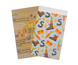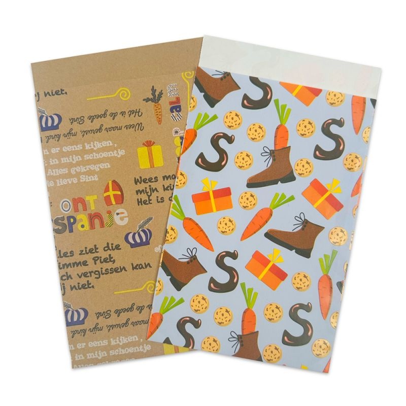 Deze Sinterklaas cadeauzakjes zijn ideaal voor het inpakken van cadeaubonnen, cadeaukaarten, loten of andere kleine cadeautjes. De blauwe zakjes zijn gemaakt van wit kraft papier en afgewerkt met een mat laminaat. De afbeeldingen zijn voorzien van een glanslaagje, dit geeft de zakjes een luxe uitstraling. De bruine zakjes zijn gemaakt van gerecycled bruin kraft papier en voorzien van leuke Sinterklaas songteksten en afbeeldingen. De zakjes zijn per omdoos van 1.000 stuks te bestellen en leverbaar binnen 1-3 werkdagen.